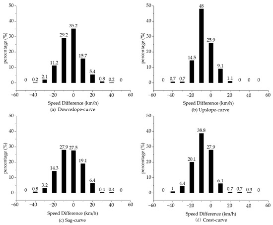 Table 3 displays that the minimum speed difference value ranges between −41.88 km/h and −32.32 km/h, with the maximum value being between 29.57 km/h and 42.53 km/h. Figure 5 illustrates the speed difference distributions for each type of combined curve.