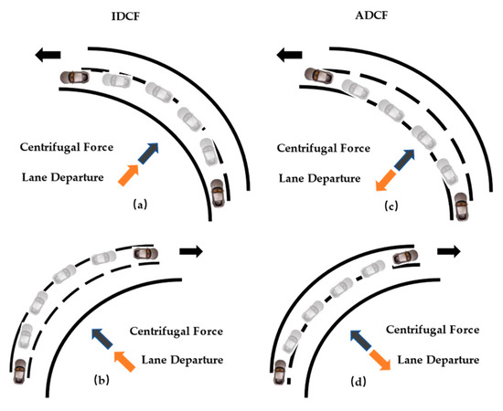The lane departure incidents on the four combined curve types were categorized into two types of departures: those in the direction of centrifugal force (IDCF) and those against it (ADCF). Figure 6 depicts a vehicle exhibiting lane departure behavior in both IDCF and ADCF.