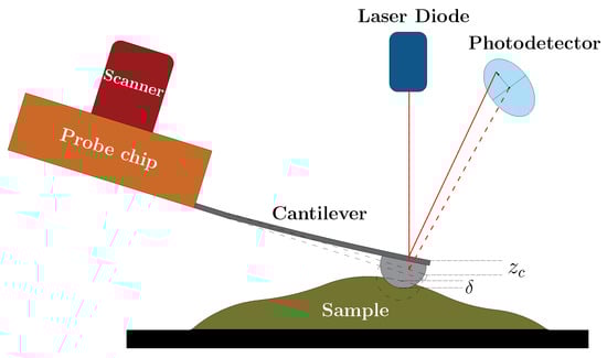 Experimental setup to obtain AFM force–indentation curves. The dashed cantilever represents its original, undeformed configuration, is the cantilever deflection and is the indentation depth.