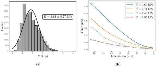 After specifying the Poisson ratio, tip radius and a set of displacement vectors, the only remaining parameters are the material properties E and , which must also be comprised in a typical range of values for soft tissues. This work focuses on studying a specific subset of soft tissues, with surface properties compatible with the available experimental data. However, if a broader range of materials was being analysed, standardizing the units of the physical quantities could potentially be helpful to improve the model’s behaviour. For the Young’s modulus, its values commonly fluctuate between the orders of magnitude of to kPa, reaching the hundreds of kPa in more specific scenarios [,,,]. Taking also into account the Young’s moduli of the samples in the experimental data available, a minimum E of 0.2 kPa and a maximum of 10 kPa were fixed, using a triangular distribution function with the mode as 1.8 kPa, so that the ML models could be trained more thoroughly on the most frequent range of values for the Young’s modulus of biological cells or hydrogels.