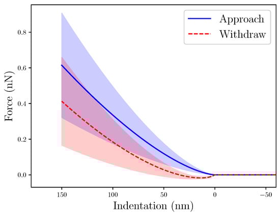 Regarding approach curves, they play a crucial role in inferring the elastic modulus of the sample and can be fitted with the models developed by Hertz [] or Sneddon []. On the other hand, retraction data offer essential insights on its adhesion properties [,,], which are particularly relevant in low-stiffness materials, such as biological cells, where they play a major role in processes such as cell proliferation and migration, and sudden changes in these properties can lead to diseases such as cancer [,] or osteoporosis [,]. Since during the retraction stage, adhesion forces between both surfaces are predicted to have a higher impact in the experiments, an Hertzian-based analysis is no longer precise enough, so other models must be employed. Amongst them are JKR (Johnson–Kendall–Roberts) and DMT (Derjaguin–Muller–Toporov) [,], which represent two extreme cases in adhesive interaction: while DMT is valid for hard samples, large tip radius and low adhesion forces, JKR meets the specific features of this work, since it is applicable for soft samples, small tip radius and high adhesion forces [].