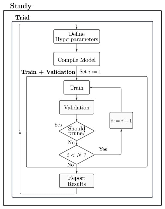 Further optimization required the use of Optuna, with the adopted workflow being schematised in Figure 4. Each hyperparameter analysis in this package is referred to as a “study”, composed of a predefined number of trials. Within each trial, it is first necessary to choose the range of hyperparameters under analysis and to set an objective function, which in this case is to minimize the validation loss. A pruning-based approach was implemented, so that unpromising trials would be discontinued, based on the median validation loss of the previous trials at a given epoch.