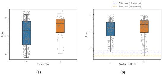 Box plots regarding hyperparameter optimization in Optuna, where each point represents a different trial from the Hertz FCNN studies. (a) Loss obtained as a function of batch size. (b) Study that determined the width of the model’s third layer.