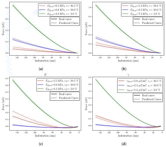 The final hyperparameters and model architecture obtained through the optimization process are presented in Table 2. Regarding the evaluation metric of the models, despite being easy to understand what is the impact of a certain relative error in the values of both target properties, it is not that intuitive to realize what its consequences are in an AFM F-I approach curve. To bridge this gap, regarding the Hertz FCNN, graphs presented in Figure 6a,b depict a comparison between the actual synthetic curves and the curves that would be produced with the predicted stiffness for that instance, obtained for different models developed along this work, with relative errors of , and higher than . For the JKR FCNN, it is also important to infer if one of the material parameters has a higher influence than the other. Figure 6c,d show that for the same F-I curves with similar relative error values for the Young’s modulus and adhesion energy, the first parameter has a higher impact on the predicted curves; hence, if we would have to prioritize the improvement on the prediction of one property, it would be the Young’s modulus.