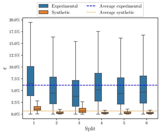 For each of the six data splits in the cross-validation procedure for the Hertz FCNN, optimal models were selected based on validation error and subsequently evaluated on both synthetic and experimental test sets. Figure 7 illustrates the distribution of percentage error values for the best model in each split. As expected, due to the strong affinity between testing and training data, predictions exhibit notably higher accuracy in synthetic data, with an average percentage error of . This outcome aligns with expectations, considering that synthetic data closely mirrors the instances on which the models were trained. Nevertheless, the results obtained on experimental test sets are also noteworthy, indicating the potential for predicting surface properties from nanoindentation curves obtained in real-world scenarios. The mean percentage error across all splits is , emphasizing the capability of models trained and validated without the inclusion of real data inputs. This underscores the effectiveness of the proposed approach in predicting surface properties using only synthetic data during the model training and validation phases.