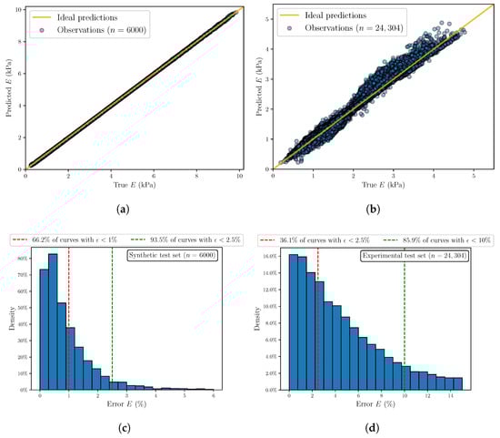 To obtain a better insight into the predictions made by our models, Figure 8 provides a detailed description of the results obtained with the best model on experimental data (from Split 3, ). For synthetic data, the predicted Young’s modulus values closely align with their true labels across the entire domain studied (Figure 8a). This results in 93.5% of the curves in the synthetic test set being predicted with a percentage error below 2.5%, with 66.2% of the instances exhibiting an error lower than 1% (Figure 8c). These highly accurate predictions confirm that the simple FCNN architecture adopted for the ML model development is well-suited for the problem at hand. While not reaching the precision observed in synthetic data, experimental predictions remain closely aligned with the real values. There is a slight tendency to overestimate the elastic modulus for curves with kPa (Figure 8b). Employing the chosen model, 85.9% of the 24,304 experimental nanoindentation curves were predicted with an error lower than 10% (Figure 8d).