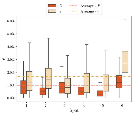 Due to the absence of fitted experimental retraction curves, the evaluation of JKR FCNNs was confined to synthetic data. Figure 9 illustrates the error distribution for the best model in each of the six splits, focusing on surface properties E and . A notable observation is that predictions of Young’s modulus were consistently more accurate than those of adhesion energy across all splits. However, both parameters exhibited highly satisfactory results, achieving average errors of and across all folds. The selected architecture and optimized hyperparameters contributed to a uniform performance across all splits and for both material parameters. The exception was Split 6, where error values were notably higher compared to the remaining splits, yet still within the range of acceptable predictions.