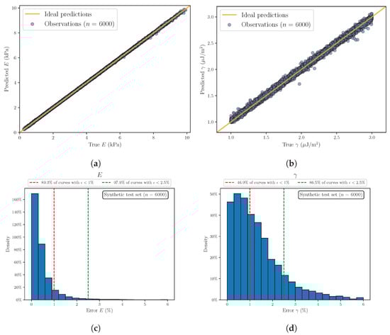 Taking as a reference a residual error of 2.5% in surface properties, which holds little significance in the comparison between real curves and those obtained with predicted outputs, we observe that 97.9% of synthetic test set curves had an elastic modulus prediction below that threshold. However, this value decreases to 86.5% for adhesion energy predictions (see Figure 10c,d).