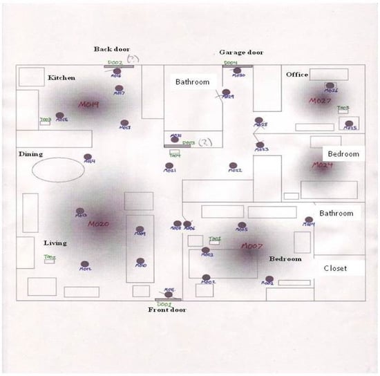 The case study is conducted using the Aruba dataset, which captures human activities recorded in a smart apartment managed by the Center for Advanced Studies in Adaptive Systems (CASAS) []. This apartment is inhabited by an adult woman and experiences regular visits from her children and grandchildren throughout the year. The period of the test is two years, from 4 November 2010 to 30 June 2011. The layout of the home and the placement of sensors are illustrated in Figure 3.