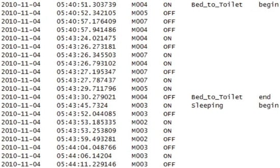 The sensor network setup comprises 31 motion detection sensors, 5 temperature sensors, and 3 door contact sensors, each identified by prefixes “M”, “T”, and “D”, respectively. Among many constructed features, some of them are not relevant depending on the considered estimation. The objective of selecting a minimum sensor configuration is not to exclude the other sensors from the house. The objective is to filter the sensors so that the algorithm goes faster with an acceptable compromise on recognition performance but with a performance gain in terms of real-time processing time. In this study, we focus on a minimal sensor configuration, selecting 11 sensors with the following identifiers: M003, M004, M009, M013, M014, M015, M017, M020, M026, M030, and D004. The data are sampled with a sampling interval of 1 s and a sampling frequency of 1 Hz. This choice is motivated by the consideration that increasing the sampling rate results in information loss. Therefore, a smaller sampling time enriches the segment with more events, enhancing the accuracy of the segmentation process. An extract from the dataset is shown in Figure 4.