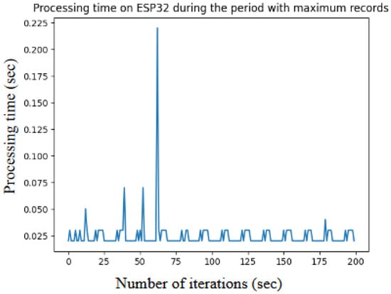 In addition, development tools, available libraries, and programming environments vary between the two platforms. Some tools or libraries may be optimized for a platform, which may affect performance. In summary, while both devices use the same amount of memory, the significant difference in processing time suggests that the ESP32 might have performance implications for the given human activity recognition algorithm. Figure 9 and Figure 10 show, respectively, the evolution of processing time with a maximum number of records. In these figures, the y-axis represents processing time in seconds, with time units, while the x-axis represents the number of iterations.