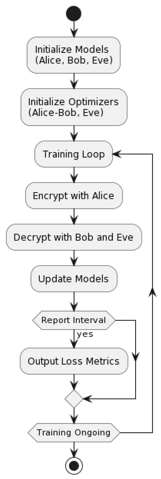 The training process updates both Alice and Bob’s models and Eve’s model once per training step. Unlike other approaches, this lack of a specified ratio between the training of Alice–Bob and Eve does not afford any computational advantage to Eve.