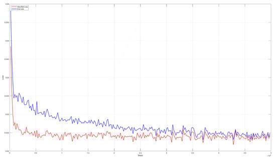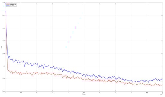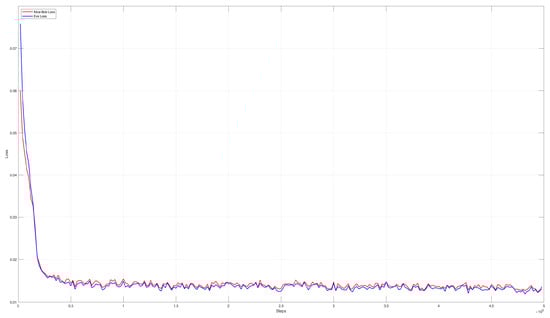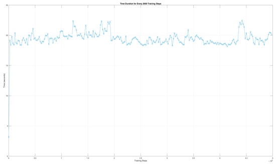 From Figure 12 and Figure 13, upon analyzing the time metrics from the initial 500,000 steps of the training process, it is evident that the computation time exhibits quasi-stable behavior, oscillating around for an approximately mean duration of 16.51 s for every 2000 steps.