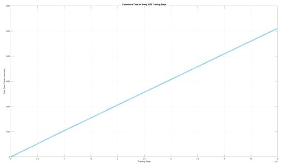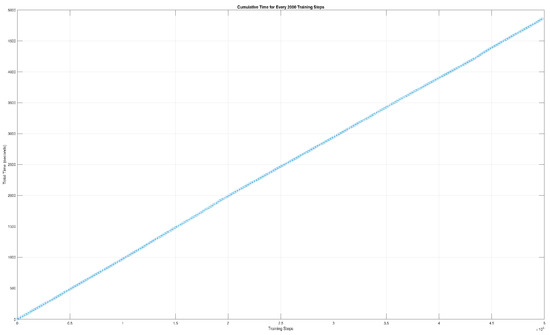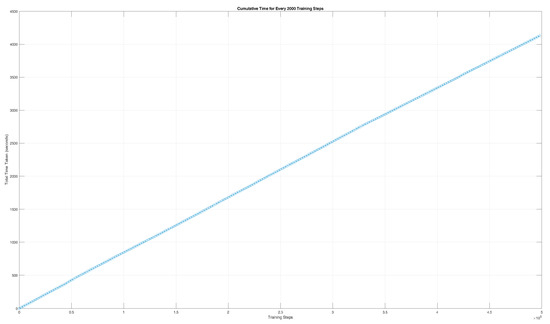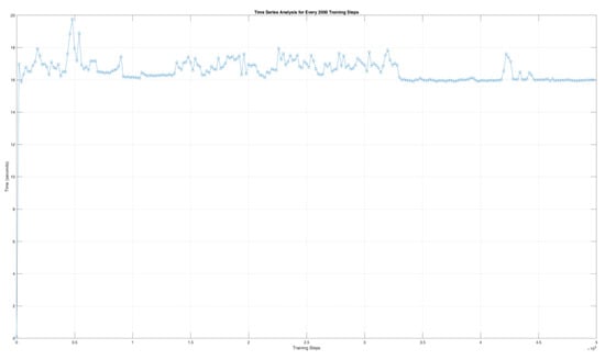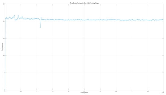 In Figure 9, upon analyzing the time series data over incremental training steps, it is evident that as the system trains, the time values stabilize and hover around the 20 s mark after an initial anomaly. This suggests that with increased training steps, the system’s performance reaches a consistent plateau in terms of execution time.