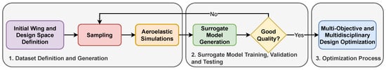 The methodology employed in this work and depicted in Figure 1 adheres to three fundamental steps commonly found in SBO: (i) dataset definition and generation; (ii) surrogate model training, validation, and testing; and (iii) the optimization process. All these tasks were performed using available open-source Python codes and specially developed Python scripts. For illustrative purposes, the methodology is applied for a cruise speed of 30 m/s, but it is applicable to other speeds.