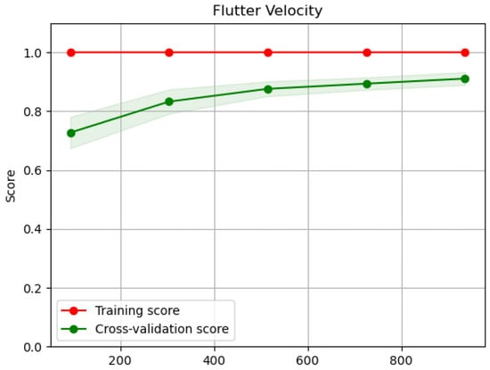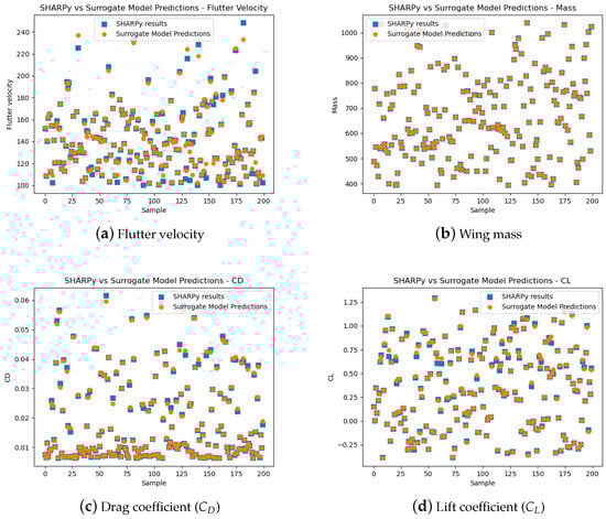 After training and validation, the model is tested on a dataset it has not seen before, known as the test set, to gauge the model’s effectiveness. Learning curves further evaluate the model’s generalization. The final surrogate models used for testing and the later optimization process are based on the optimal hyperparameters obtained for each model after tuning. The suitability of surrogate models for the aeroelastic analyses required for the optimization process was visualized using parameters from the testing dataset. The results for each model are shown in Figure 2.
