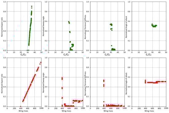 For sampling, Latin Hypercube Sampling (LHS) was adopted using the pyDOE2 package [30] due to its uniform coverage across the design space and its efficient sampling scheme. Simulations conducted in SHARPy focused on the wing metrics to be used in the optimization: structural mass, flutter speed, and aerodynamic coefficients ( and ). For this study, 2000 simulation samples were generated. Despite this number appearing to be modest given the complexity of the problem, the high computational demands of SHARPy made this a significant effort. Each simulation averaged around 93.5 s. The simulations were run on a host computer with Windows 11, an Intel i7-10510U processor, 16 GB DDR4 RAM, and a 477 GB SSD. This machine also used NVIDIA GeForce MX250 graphics. Within this system, a virtual machine operated on Ubuntu 22.10, utilizing 4 cores, 11 GB RAM, and 59.2 GB of storage space. Virtualization was facilitated by Oracle VM VirtualBox 7.0.6.