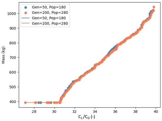 However, this intensive optimization resulted in a 491% increase in computational time. Nevertheless, the potential for greater accuracy seems to justify the additional computational effort. Comparing the Pareto fronts in Figure 6, an improvement was evident, especially at higher values. In these cases, the advanced optimization provided better aerodynamic efficiency with a lower mass increase. However, for some design choices, there was a significant overlap in results between the initial and advanced optimizations, indicating that increasing iterations and population sizes do not always lead to different results.