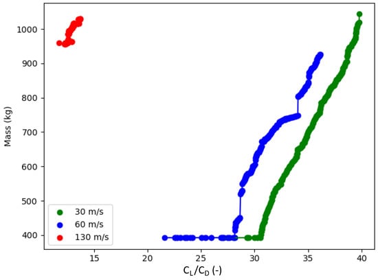 The plot presented in Figure 8 delineates the Pareto fronts for the three analyzed cruise speeds, 30 m/s, 60 m/s, and 130 m/s, derived using the same optimization parameters. It is important to note that the results at 130 m/s represent only the feasible solutions. As the cruise speed increases, the Pareto front tends to be narrower and shift toward lower values, as expected. The results at 130 m/s present an evident distinction. Unlike the relatively distributed Pareto fronts at 30 m/s and 60 m/s, the solutions at 130 m/s are remarkably more clustered. This localized concentration indicates that, at this higher cruise speed, design solutions that avoid flutter are limited, especially within the limits of our design space. Moreover, these solutions at 130 m/s are characterized by relatively high masses and moderate values. At higher speeds, the overly stringent constraint of flutter speed within our design space leads to results in which, to avoid flutter, the wing structure needs to be heavier, consequently compromising its aerodynamic efficiency.