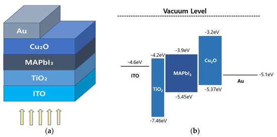 In this paper, Cu2O was selected as the hole transport layer (HTL) material. Because Cu2O has a low bandgap energy of 1.8~2.5 eV, the efficient conversion of light into electrical energy is possible, and it has a high hole mobility, enabling the photovoltaic solar cell efficiency to be improved [46,47]. Furthermore, Cu2O is a stable material and does not undergo significant changes in its electronic properties, even under harsh conditions, and it is a non-toxic and environmentally friendly material, making it a desirable choice for applications in the fields of energy and environment [48,49]. Therefore, in this study, TiO2 and Cu2O were selected as the ETL and HTL materials, respectively, based on these excellent characteristics and the band alignment of the energy band diagram. In summary, this study optimized the power conversion efficiency (PCE) of perovskite solar cells using TiO2 as an Electron Transport Layer (ETL), MAPbI3 as an absorber layer, and Cu2O as a Hole Transport Layer (HTL), respectively.