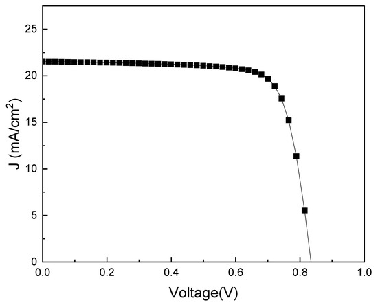 Prior to the optimization of each factor affecting the efficiency of PSCs, the initial conditions for the PSC device were set: an ETL TiO2 layer thickness of 100 nm, a PAL MAPbI3 layer thickness of 600 nm, and an HTL Cu2O layer thickness of 400 nm. Figure 2 shows the current density–voltage (J–V) graph of the initial PSC. The maximum optical conversion efficiency was calculated using Equations (6) and (7) [60] while considering the initial conditions as 13.79%.