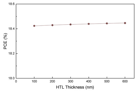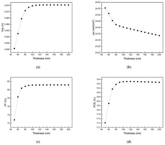 The PCE of PSCs is affected by the properties of ETL and HTL materials. Furthermore, the thickness of the thin film is closely related to its electrical properties, which determine the transport of electrons and holes. Thickness is also directly related to PCE. Thus, as shown in Figure 3, we first investigated the effects of thickness on the Voc, Jsc, FF, and PCE of the Cu2O HTL layer. Extremely thin HTL film forms micro-pinholes, resulting in direct contact between the absorption layer and the rear electrode, and an extremely thick HTL can increase the series resistance in the interface between the metal electrode and the HTL [61].