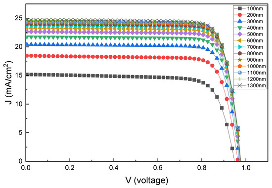 Figure 6 shows the current density–voltage (J–V) plot for various PAL thicknesses, and Figure 7 shows Voc, Jsc, FF, and PCE values as functions of PAL thickness (100–1300 nm). As shown in Figure 7d, with an increasing PAL thickness, the PCE gradually increases until the thickness of the PAL reaches 1300 nm with the highest conversion efficiency of 19.30%. Afterwards, the PCE tends to decrease with an increasing PAL thickness. This decrease in PCE was attributed to the increasing electron–hole recombination in the absorption layer, rather than the generation of electron–hole pairs [64,65,66]. The Jsc value increases as the thickness of PAL increases, which is due to improved light absorption [67]. It increases sharply from 15.18 mA/cm2 to 23.70 mA/cm2 for the range of 100–700 nm. Beyond this thickness, it increases slowly until it saturates at 24.91 mA/cm2. Additionally, as Voc increases from 100 nm to 1200 nm, PCE also increases. Afterward, from 1300 nm to 2000 nm (not shown in Figure 6), Voc slightly decreases. The initial increase in Voc indicates a reduction in charge carrier recombination within the thin absorber layer, but as the thickness increases beyond 1300 nm, the decrease in Voc could be due to a reduction in the effective bandgap and increased recombination [68].