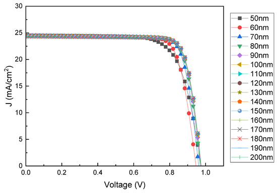 Figure 8 exhibits the current density-voltage (J–V) graphs for different ETL (TiO2) thicknesses, and Figure 9 shows the effects of ETL thickness on Voc, Jsc, FF, and PCE. As shown in Figure 9d, PCE increases with ETL thickness until the thickness of the ETL layer reaches 100 nm and decreases afterwards. The maximum PCE of 19.30% is observed at an ETL thickness of 100 nm. An overly thin ETL leads to leakage current and device failure due to discontinuity. Therefore, as the thickness increases up to 100 nm, the efficiency also increases. After reaching the maximum of 19.30% at 100 nm, the PCE efficiency decreases with an increasing ETL thickness because, similar to the HTL, the charging resistance and series resistance rapidly increase with the ETL thickness, resulting in a decrease in PCE due to absorption loss [69,70].
