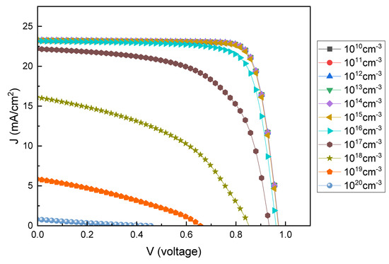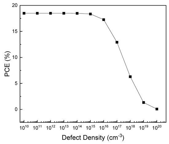 The defects of the absorption layer can interfere when the carriers in the device move to electrodes [71]. The PAL defect density was changed from 1010 to 1020 cm−3 to determine its effect on the PSC characteristics. Figure 10 and Figure 11 show the current density–voltage (J–V) graphs and changes in PCE according to the PAL defect densities. With an increase in defect density up to 1015 cm−3, the PCE remains at ~17%; however, with a further increase in defect density, PCE decreases to 13%. The Shockley–Read–Hall model shows that an increase in carrier life can reduce recombination [72,73,74].