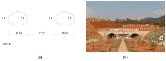 The case study tunnel selected for this research is the Xiangyangshan Tunnel located along the Qujing-Kunming Expressway in Yunnan Province, Southwest China. The Xiangyangshan tunnel is situated in the middle of the eastern Yunnan platform fold belt. The geological structure is highly intricate, particularly with a well-developed fault structure. The clearance width of a single tunnel on the standard section is 15.53 m, and the maximum excavation area is 167.6 m2. It is a three-lane extra-large section highway tunnel. The tunnel is designed as a left and right tunnel with a typical shallow buried section and a double tunnel spacing of 23.07 m. The cross-sectional dimensions of the lining structure and the tunnel’s portal site under construction are illustrated in Figure 1. The surrounding rock mass of the tunnel is categorized as grades V2 to III1, as assessed in accordance with the Chinese industry standard “Code for Design of Road Tunnel (JTG D70-2004)” [22]. The tunnel exhibits numerous fault fracture zones, developed joints, and fissures, leading to a rock mass that is relatively fragmented and unstable.