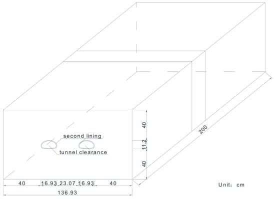 Given the intricate and time-consuming nature of the model testing process, as well as the extended duration required for each experiment, only two tunnel models were constructed. Considering the research scope and testing conditions, the geometric similarity ratio of the test model is set at 1/100. The geotechnical model is designed to have dimensions of 91 cm in total height, 200 cm in total length, and 137 cm in total width, with a mass density of 1. The elastic modulus similarity ratio is 1/100, and other physical quantities are scaled accordingly based on the principles of similarity. The physical parameters and similarity relationships between the model and prototype are outlined in Table 1. Table 2 provides detailed information on the setup conditions of the two test models. Figure 2 and Figure 3 show the size and preparation of the shake table model.