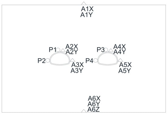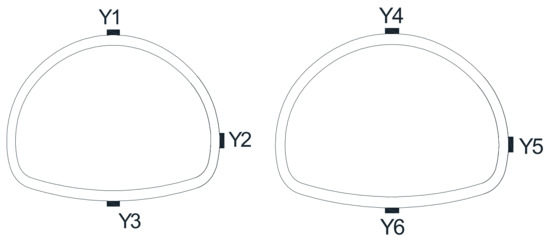Strain sensors were positioned at designed monitoring sections A–A, B–B, C–C, D–D, E–E, F–F, G–G, H–H, I–I, J–J, and K–K (refer to Figure 4). A total of six strain gauge measuring points were placed on the outer surface of a single tunnel lining (see Figure 5). Each measuring point was equipped with two longitudinal and circumferential test channels, denoted by the symbol “Y” for strain measurement. Dynamic earth pressure testers and accelerometers were installed in sections C–C, D–D, E–E, F–F, G–G, H–H, and I–I. A dynamic earth pressure gauge (marked by the symbol “○” and sequentially labeled with number after the letter P in Figure 6) was positioned near the middle of each tunnel vault and left wall, respectively. An accelerometer was arranged at the top of the model box tunnel for each X/Y direction, and another accelerometer was placed at the bottom plate of the model box for each X/Y/Z direction. Additionally, two accelerometers were positioned at the middle of the right wall and the vault, one for each X/Y/Z direction.