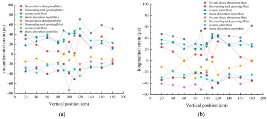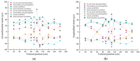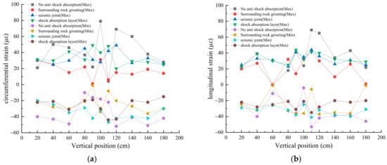 The assessment of circumferential and longitudinal strain along the tunnel’s axial direction under different seismic wave excitations and anti-vibration strategies was carried out using the findings from the model tests, illustrated in Figure 7, Figure 8 and Figure 9. The testing segment of the tunnel model is positioned within the vertical range of 90–110 cm.
