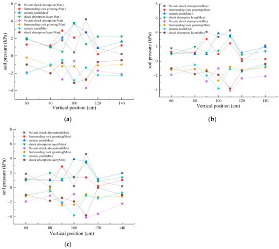 In Figure 10b, under Taft wave excitation, following the grouting of surrounding rock, installation of anti-seismic joints, and implementation of shock absorption layers, the reduction ratio for the maximum increment of lining earth pressure was −28%, −9.3%, and −20.9%, respectively. Similarly, the reduction ratio for the minimum increment of lining earth pressure was −34%, −7.3%, and −7.3%, respectively. In Figure 10c, under artificial wave excitation, after the completion of grouting, installation of anti-seismic measures, and integration of shock absorption layers, the reduction ratio for the maximum increment of lining earth pressure was −37%, −15.2%, and −26.1%, respectively. Additionally, the reduction ratio for the minimum increment of lining earth pressure was −41.4%, −7.3%, and −7.3%, respectively.