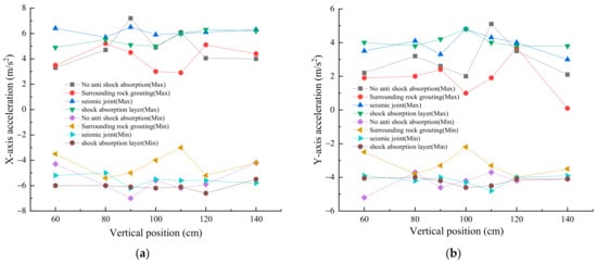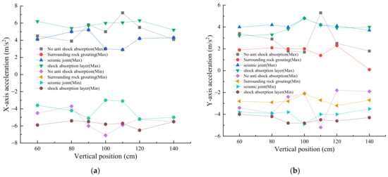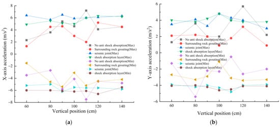 Likewise, from Figure 13, under artificial wave excitation, after grouting of surrounding rock, setting of seismic joints, and incorporating a shock absorption layer, the reduction ratio of the maximum acceleration in the X axis was −27.8%, −9.7%, −12.5%, respectively, while the reduction ratio of the minimum acceleration in the X axis was −28%, −17.3%, −12%, respectively. The reduction ratio of the maximum acceleration in the Y axis was −43.8%, −15.8%, −15.8%, respectively, and the reduction ratio of the minimum acceleration in the Y axis was −37%, −11.1%, −14.8%, respectively.