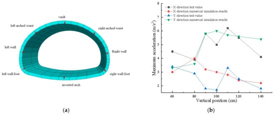 Validation of numerical simulation: (a) lining cross section and monitoring points; (b) comparison of numerical simulation results with model test results.