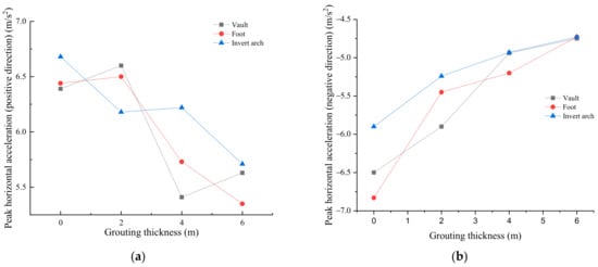 Effect of grouting thickness on horizontal acceleration in (a) positive and (b) negative directions.