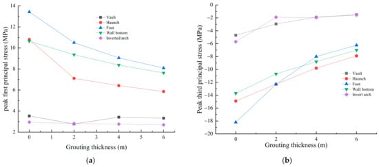 Effect of grouting thickness on (a) first and (b) third principal stresses.