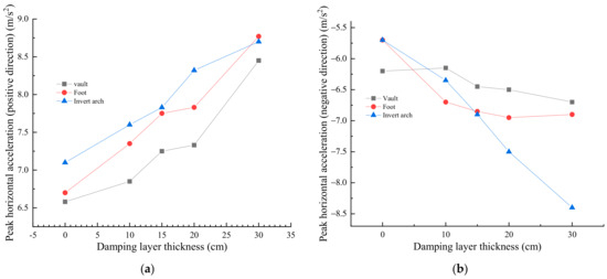 Effect of shock absorbing layer thickness on horizontal acceleration in (a) positive and (b) negative directions.
