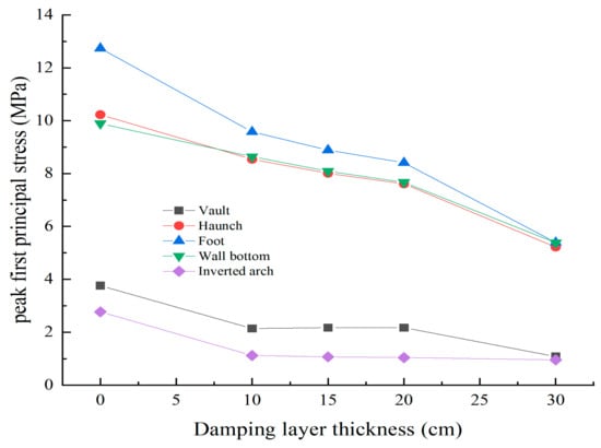 In this section, the shock-absorbing layer was positioned using the “surrounding rock-initial support-shock absorbing layer-secondary lining” method. Four thicknesses were considered: 10 cm, 15 cm, 20 cm, and 30 cm, and compared with the condition without a shock absorbing layer. The peak horizontal accelerations (positive and negative) and peak principal stresses at critical locations in the tunnel for different shock absorbing layer thickness conditions are depicted in Figure 18 and Figure 19.
