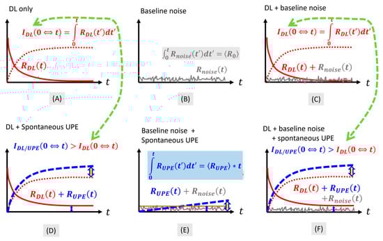 The principle that is intuitive to the proposed approach is illustrated in Figure 1 in the context of what contributes to photon emission post-stimulation, forming delayed luminescence. We denote the pure delayed photon emission (photon flux, or the number of photons per area per time) as . A time integration of the delayed luminescence alone then leads to