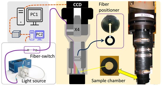 The system used for time-integrated acquisition of delayed luminescence of yeast sample is illustrated in Figure 2. The imaging system was configured based on a customized light-tight chamber facilitating bottom-loading of the sample, imaging by a CCD camera, and fiber-delivering of photo-irradiation into the light-tight chamber. The light-tight chamber contained an upper segment that held a CCD camera (Pixis-512F, Princeton Instruments, 512 × 512 pixels, 16-bit data resolution, operating temperature −70 °C) and a 4× microscope objective lens. The middle segment of the light-tight chamber contained an annular structure co-centric to the inner volume of the chamber to let through a 320 μm fiber [22] while unblocking the view of the camera in imaging the bottom-loaded sample. The annular structure to position the fiber was fixated to the inner wall of the chamber using an O-ring. The lower segment of the light-tight chamber held the sample platform that could be bottom-loaded. The three segments of the imaging chambers were connected by black rubber tube adaptors that also worked as light-tight seals. The 320 μm fiber for illumination was passed through the upper edge of the rubber seal, which was compressed against the lens module to ensure light tightness. The 320 μm fiber was coupled to a laser-driven light source (LDLS, Energetiq (Wilmington, MA, USA) EQ-99X-FC, 190 nm—2500 nm, coupled to a 230 μm fiber) [23] via a fiber switch (Piezosystemjena (Jena, Germany), 9 × 1, fitted with 200 μm fiber). Since the LDLS of continuous operation lacked a shutter control, the illumination of the sample was controlled by turning ON and OFF the fiber switch. The fiber switch was controlled by a desktop computer (Dell OptiPlex GX520, Windows NT) via a vendor-provided interface. Another desktop computer (Dell Dimension 5150, Windows NT) controlled the CCD imager via a vendor-provided WINSPEC user interface. This control configuration was chosen as it was manageable for the task given the limitation of the hardware settings. And this configuration was the main determinator of the post-operation time as is described in a subsequent section.