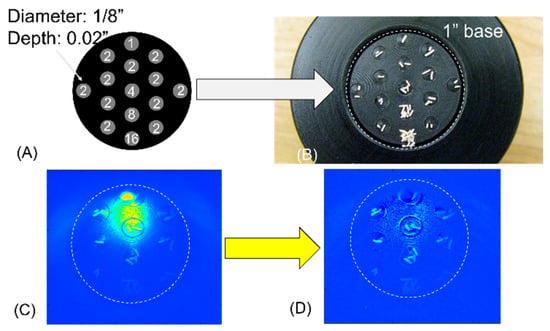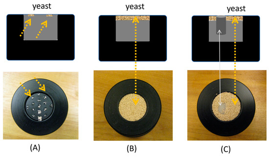 A master sample holder, as illustrated in Figure 3, was fabricated for the bottom-loading of the sample into the light-tight chamber depicted in Figure 2. The master sample holder had a central receptacle to place a cylindrically shaped bulk sample or another sample platform of a neat-fit cylindrical size for a finer arrangement of the samples. The samples that could be placed in the master holder included reflectance standards (Spectrolum) with reflectivity ranging from 2% to 99%, a custom-fabricated scattering solid-phantom [23], which had a scattering coefficient of 1 mm−1 and an absorption coefficient ranging between [0.005, 0.021] mm−1, and retail yeasts [Fleischmann’s Bread-Machine instant yeast, Walmart Inc., Bentonville, AR, USA]. One sample platform had 16 slightly receded circular pockets on the surface for placing yeast of a specific grain count, up to 16 grains. A few ways that some samples were placed in the sample chamber are exemplified in Figure 3. The imaged area was approximately 2.5 cm in diameter.