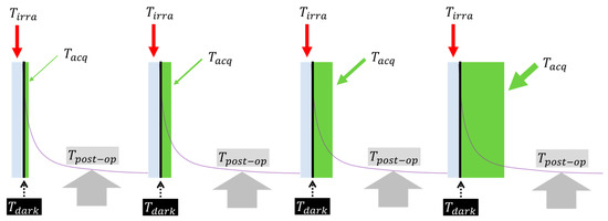 The time sequence of interleaving the irradiation and data acquisition for imaging the delayed luminescence is illustrated in Figure 4. Each cycle contained 4 phases of time: (1) irradiation, (2) dark time, (3) acquisition, and (4) post-operation. The four phases were set for the following functional needs of the proposed approach, which were also dictated by the instrument’s configurability.