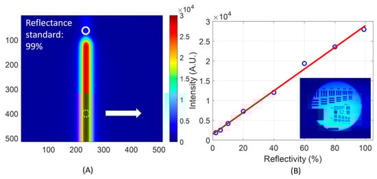The response of the imaging system to the luminescence of the sample was measured from reflectance standards differing in reflectivity, under the same illuminance, and acquired at the minimal exposure time (1 us) possible of the CCD imager. (A) shows the image acquired from a reflectance standard of 99% reflectivity. The vertical strip was an artifact that resulted from iterative specular reflection of the diffused light between the surface of the reflectance standard and the imaging optics. The intensity was assessed over two localized regions of approximately 21 pixels each way (horizontally and vertically). One spot was local to the brightest section of the vertical strip, and another spot was beyond the upper tip of the vertical strip, corresponding to the projected position of the illuminating fiber. (B). The intensity assessed at the zone marked by the dashed circle in (A), as a function of the reflectivity of the reflectance standards, is plotted. The inset in (B) shows the focus on the sample surface. The right-pointing arrow in (A) indicates the central spot around which the data corresponding to the plot of (B) were processed.