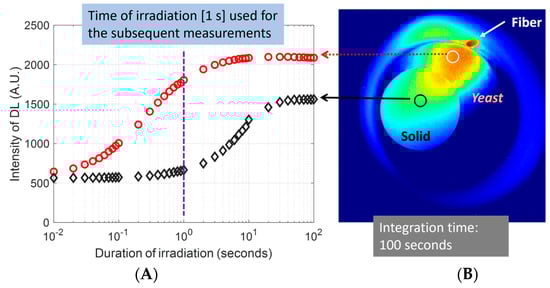 - The time of irradiation was the duration of switching on the fiber light delivery via the fiber switch. The fiber-delivered irradiation was switched on for 1 s. The duration of 1 s was determined after experimenting with the time of irradiation of yeasts from as short as 1 ms to as long as 100 s. The 1 s duration provided a good balance between adequate signal-to-noise ratio and non-saturated irradiation, as will be shown in one section of the results.