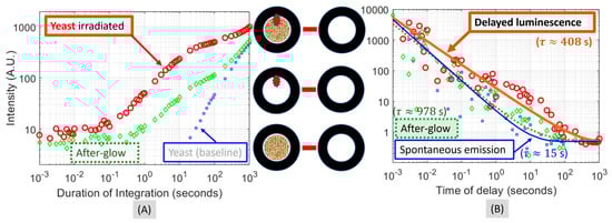 The time-integrated luminescence of the three non-baseline conditions shown in Figure 7 are plotted in Figure 8A after subtracting the baseline trace, or the bottom-most trace of Figure 7. The bottom trace marked by the blue squares of the smallest size represents the integration of the spontaneous irradiance from the yeast. As the time of integration increases, this trace, starting noticeably at ~10 s (the smaller values were cut off at the scale), increases steadily at a near-constant slope. The medium trace marked by the green diamonds of the medium size represents the integration of the afterglow irradiance of the illumination-delivery fiber. As the time of integration increases, this trace starts to ascend noticeably at 0.1 s and gradually merges with the bottom trace. The merging of the ascending medium trace with the ascending bottom trace below indicates that the slope of the medium trace was smaller than that of the bottom trace. The top trace marked by the red circles of the largest size represents the integration of the delayed luminescence of the yeast in the presence of the afterglow of the illumination-delivery fiber. This top trace ascends earlier than the medium trace and remains above the medium trace over the entire range of time.