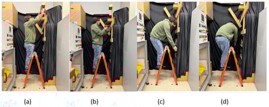 For the experimental phase, a setup was prepared to reproduce the four selected tasks (both from the ground and on the ladder. Three video cameras (Nikon D3300, Tokyo, Japan) were positioned on the right side (Figure 2a), behind (Figure 2b), and above (Figure 2c), in order to acquire the postures assumed by each subject for each task.