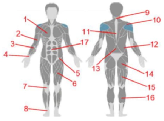 Localized Postural Discomfort Assessment. (1) chest; (2) arm (left and right); (3) forearm (left and right); (4) wrist (left and right); (5) pelvis; (6) thigh (left and right); (7) knee (left and right); (8) ankle (left and right); (9) neck; (10) shoulder (left and right); (11) back (dorsal area); (12) hip (left and right); (13) back (lumbar area); (14) buttock; (15) quadricep (left and right); (16) calf (left and right); (17) abdomen.
