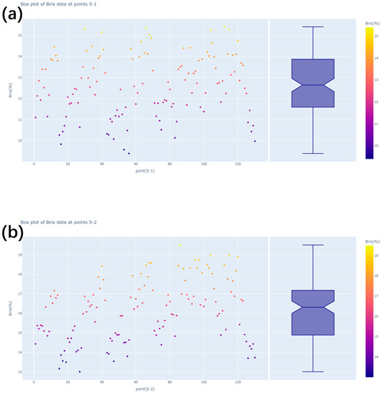 The mango sample undergoes processing involving peeling, crushing, and pressing, while the sugar content is calibrated through visible spectrophotometry employing a DHR 95 refractometer [29]. Each point undergoes three measurements, with the average value serving as the standard brix content for that specific point. Based on the aforementioned analysis, points 5-1, 5-2, and 5-3 are identified as calibration data for mango brix content. Corresponding boxplots are generated for the collected data, depicted in Figure 7a–c. Notably, point 5-1 represents the mango’s root section, point 5-2 reflects the equatorial region, and point 5-3 corresponds to the mango’s top portion. Importantly, all brix values for these points exhibit an absence of outliers, thus necessitating no additional data preprocessing.